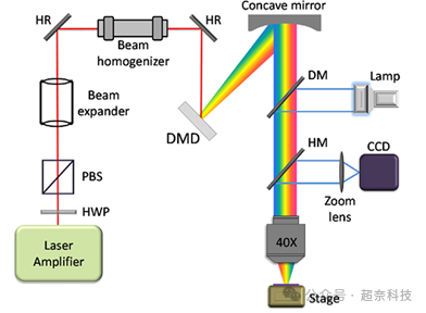 FP NanoPrinter将再生飞秒激光放大器与数字微镜器件(DMD)结合,通过空间和时间聚焦生成深度分辨可编程光片。具体工作原理如下: